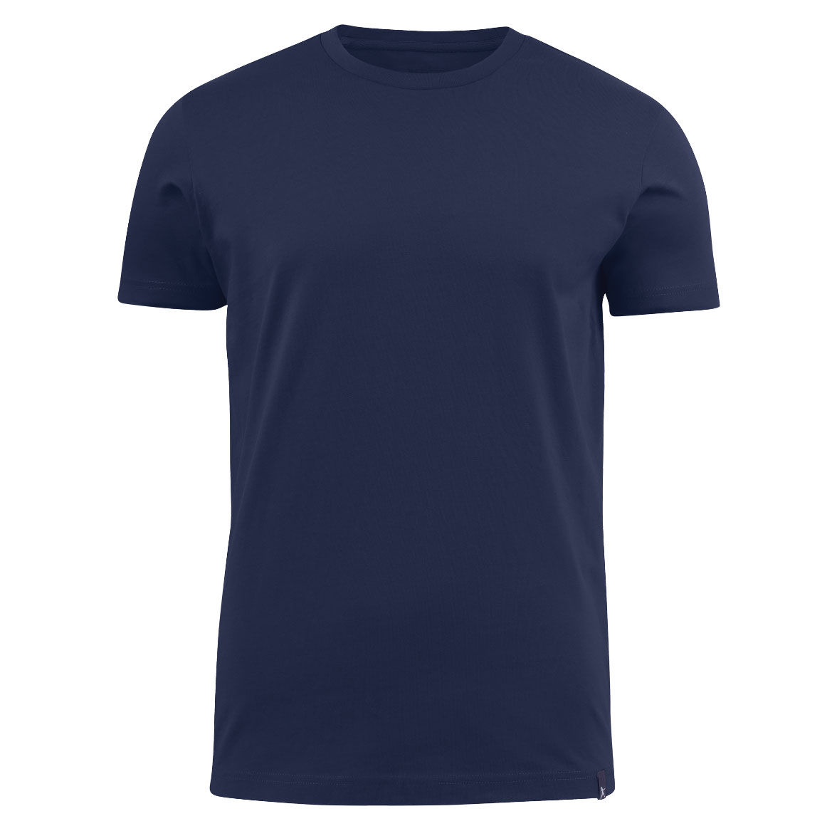 Mens modern crewneck T-shirt. 2-layered stretch rib in the neck.