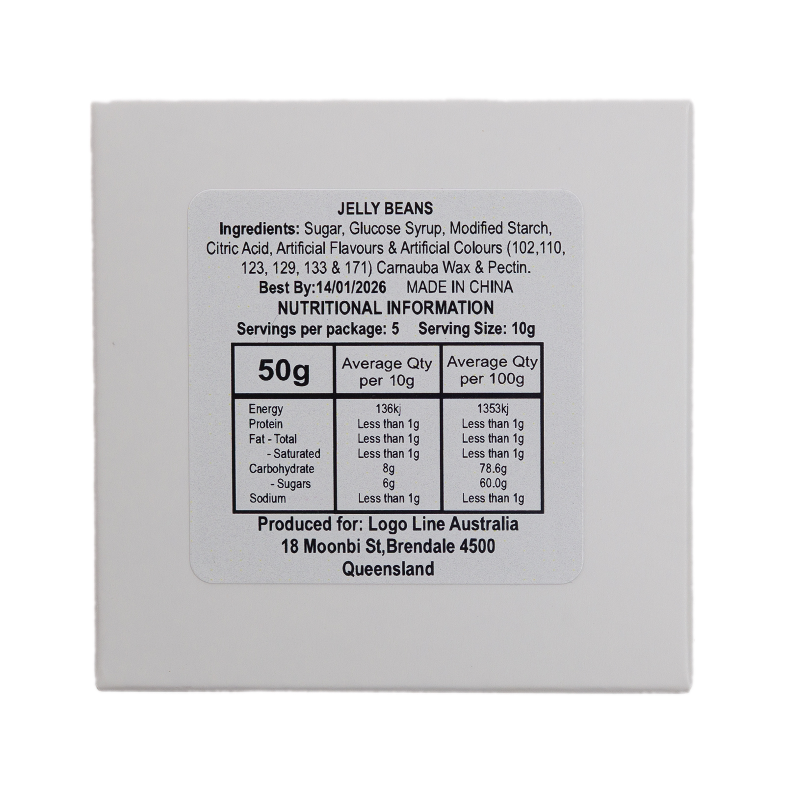 Enjoy 50 grams of gluten-free Assorted Colour Mini Jelly Beans, neatly packed in a white tuck box. Each box includes a fun mix of nine great colours and flavours — White (Lychee), Yellow (Lemon), Orange (Orange), Red (Strawberry), Purple (Grape), Pink (Raspberry), Green (Apple), Blue (Blueberry), and Black (Aniseed). Perfect for promotional giveaways, these colourful treats are a sweet way to share your brand.