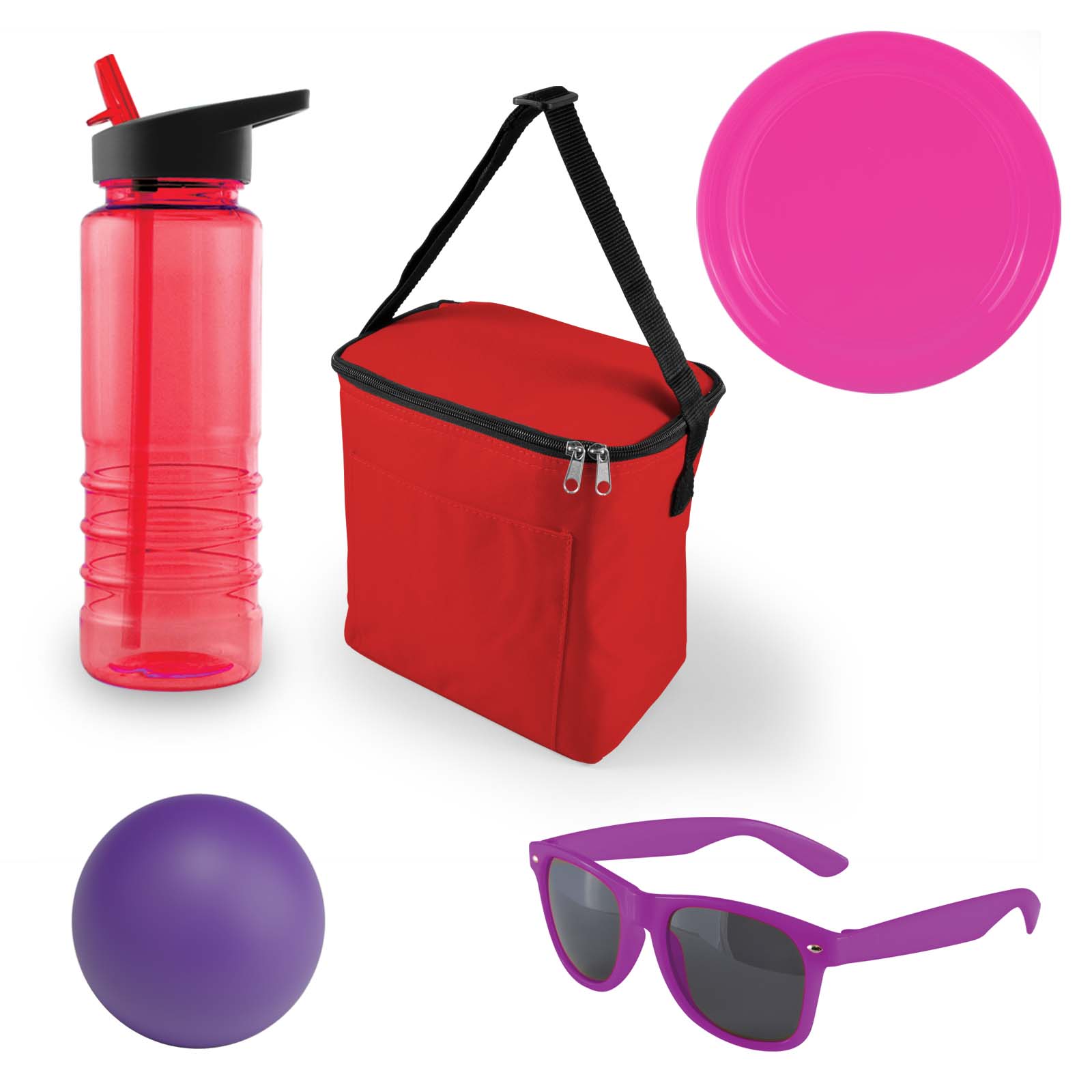 - Print Areas: Screenprint: Bag Front – 130 x 80mm (LxH), Bag Lid – 150 x 80mm (LxH), Flyer – 140mmDiameter, Drink Bottle – 190 x 65mm (LxH); Digital Transfer: Bag – Front – 130 x 140mm (LxH); Pad Print: Hi Bounce Ball – 30mm Diameter, Sunglasses – Arm/s – 45 x 8mm (LxH); Digital Print: Hi Bounce Ball – 25mm Diameter, Flyer – 140mm Diameter, Water Bottle – 30 x 70mm (LxH)