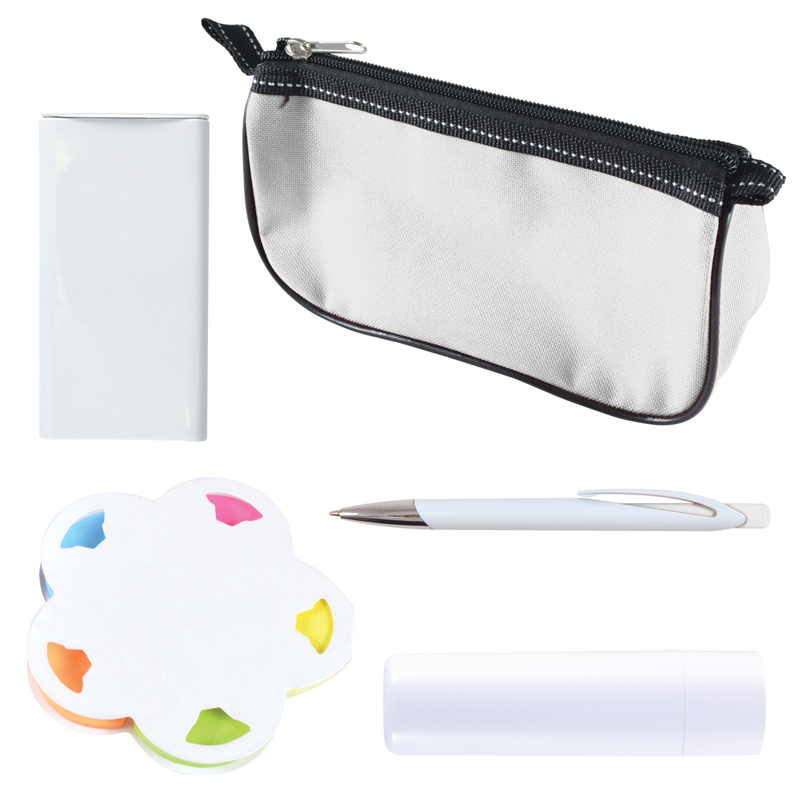 - Materials: Lip balm: PP Tube; Pencil case: polyester; Mints: spearmint; Pen: PP; Sticky Notes: paper.