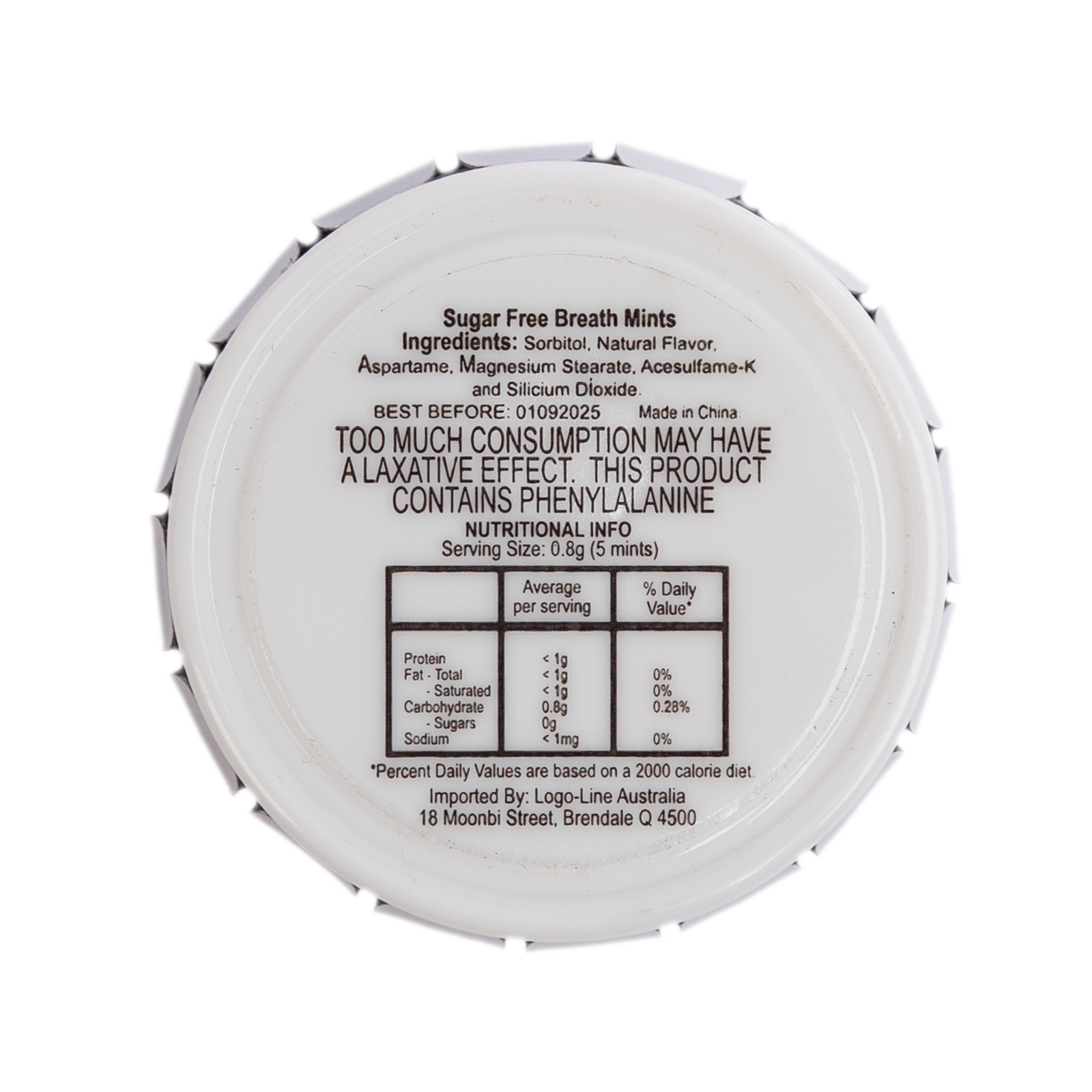 - Plastic container with 60 sugar free mints. Foil sealed click lock tin lid.