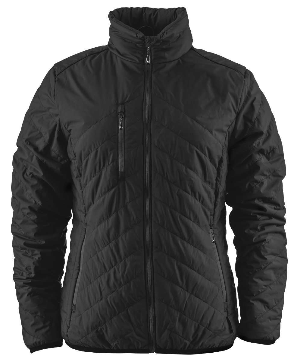 Ladies’ quilted lightweight jacket. Fully lined with hidden hood inside the collar (invisible zip). Reversed coil zip at centre front, and pockets. Elastic binding at bottom hem and sleeves. Jacket can be tucked into the front pocket which transforms into its own storage pouch. Invisible zip on the inside for ease of decoration.
