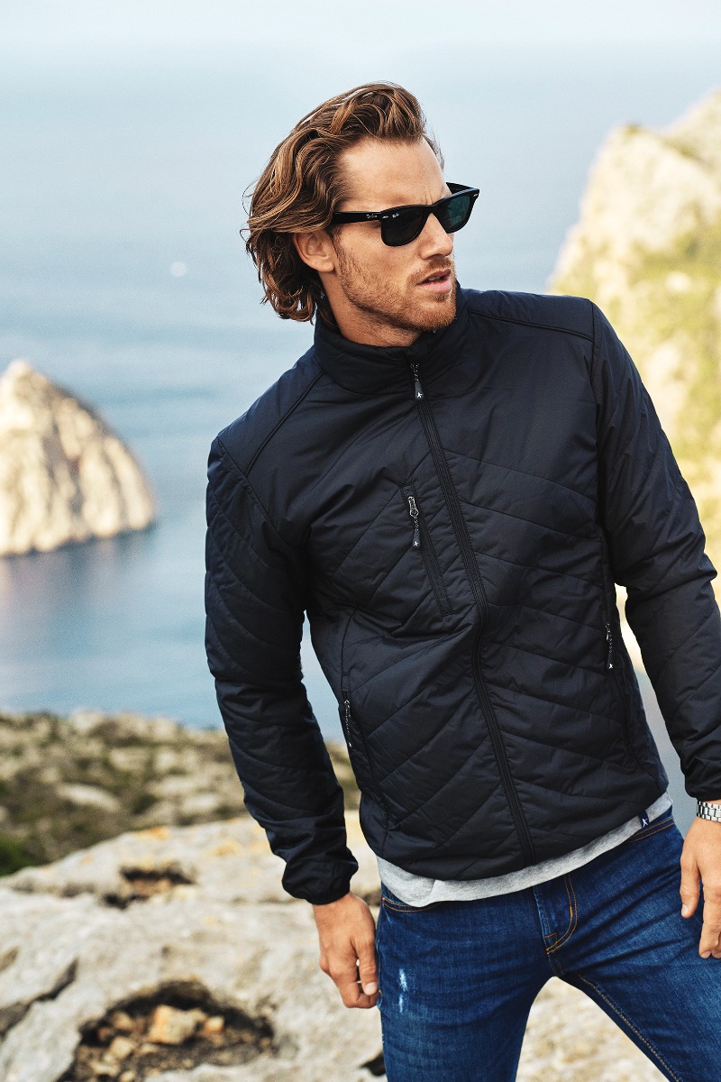 Mens’ quilted lightweight jacket. Fully lined with hidden hood inside the collar (invisible zip). Reversed coil zip at centre front, and pockets. Elastic binding at bottom hem and sleeves. Jacket can be tucked into the front pocket which transforms into its own storage pouch. Invisible zip on the inside for ease of decoration.