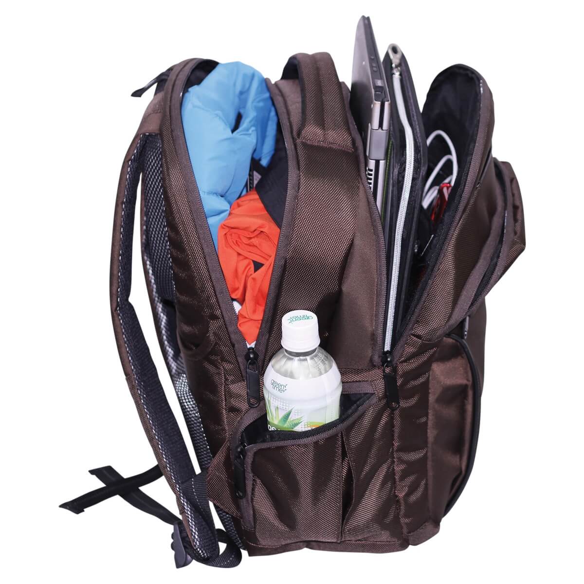 1680D polyester/Jacquard nylonFront zip pocket with multi-function organiserLarge main compartment for maximum storagePadded rear compartment to store and protect laptop (fits up to 15” laptop)Middle compartment has both slip and mesh pockets for versatilityGenerously padded back panel for carrying comfortTough and modernAdjustable, padded shoulder straps and top grab handleBa