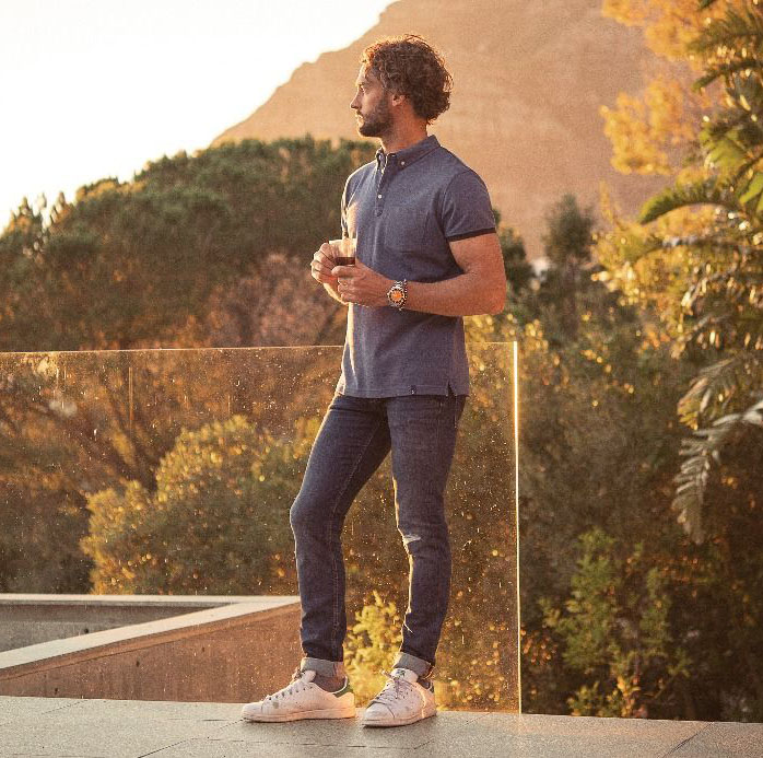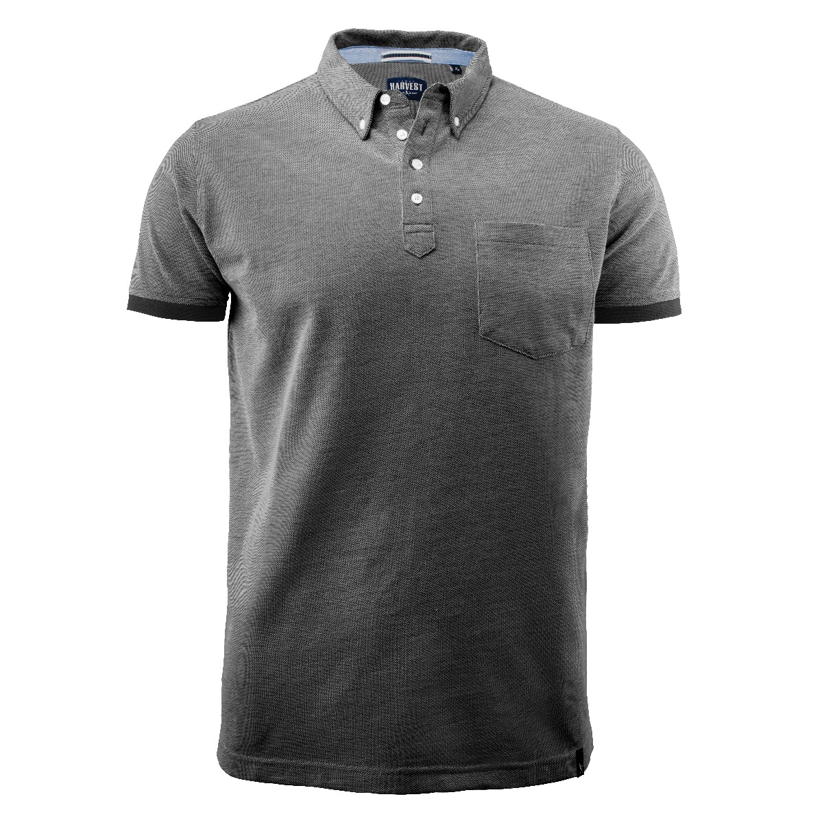 Mens’ modern fit piqué polo with button-down collar, contrast lining inside collar, and contrast ribbing at cuffs.