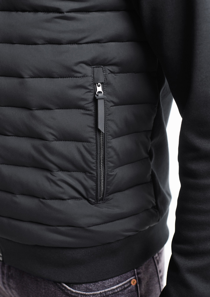 Quilted panel: 89% Polyamide, 11% Elastane, 70 GSM; Knit panel: 51% Cotton, 49% Polyester, 305 GSM; Lining: 100% Polyester, 68 GSM; Polyfil 220 GSM; Rib: 95% Polyester 5% Elastane, 530 GSM