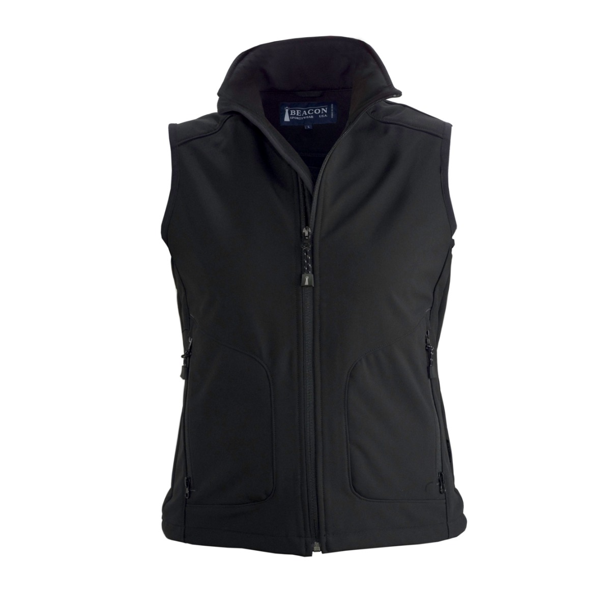 Ladies wind and water repellent softshell vest. Two side pockets with zips. Tailored fit. Adjustable drawstring at hem.