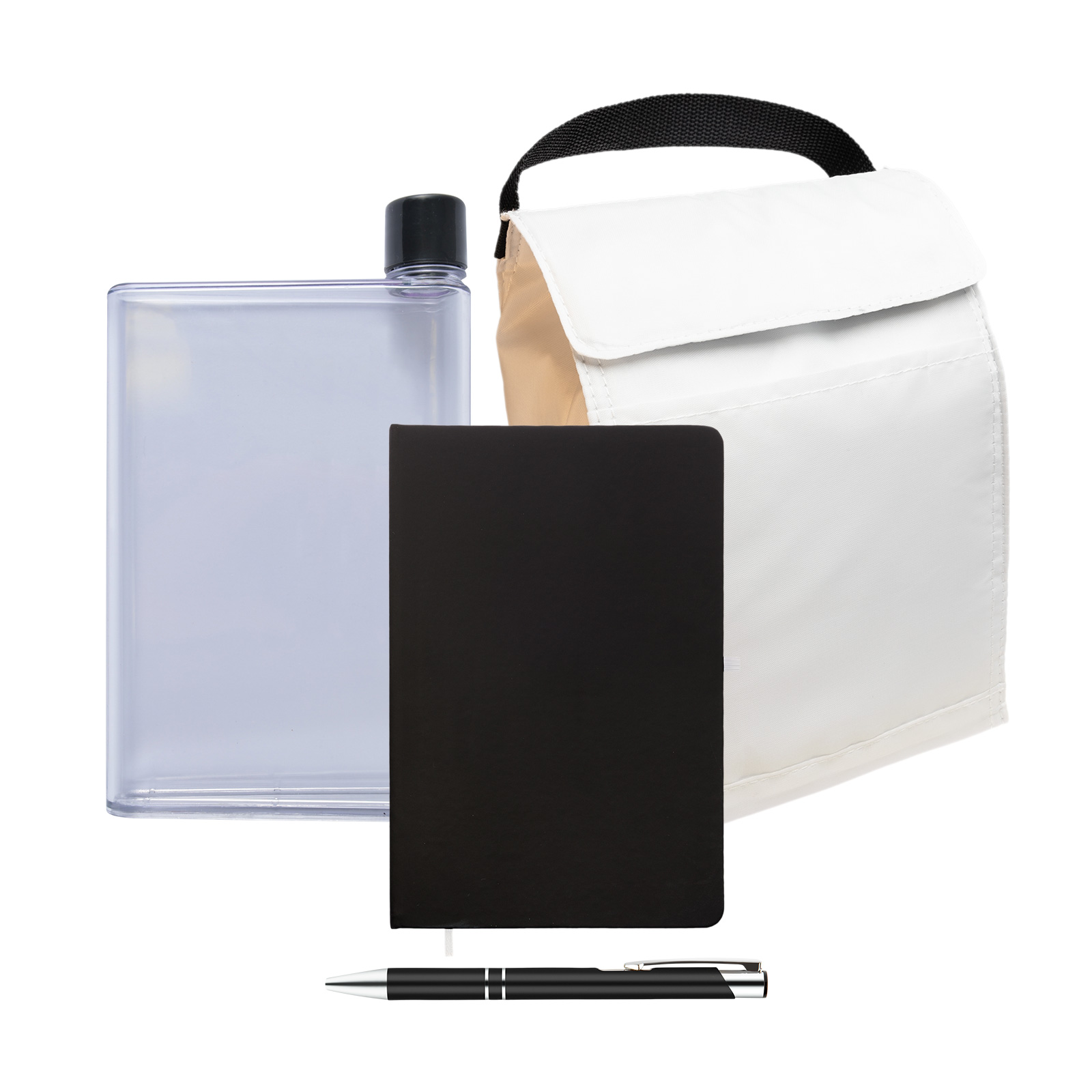 Comprehensive Office Essentials: Includes a Sumo lunch cooler, Venture Notebook, Aluminium Napier Pen, and Clear Flat Drink Bottle.