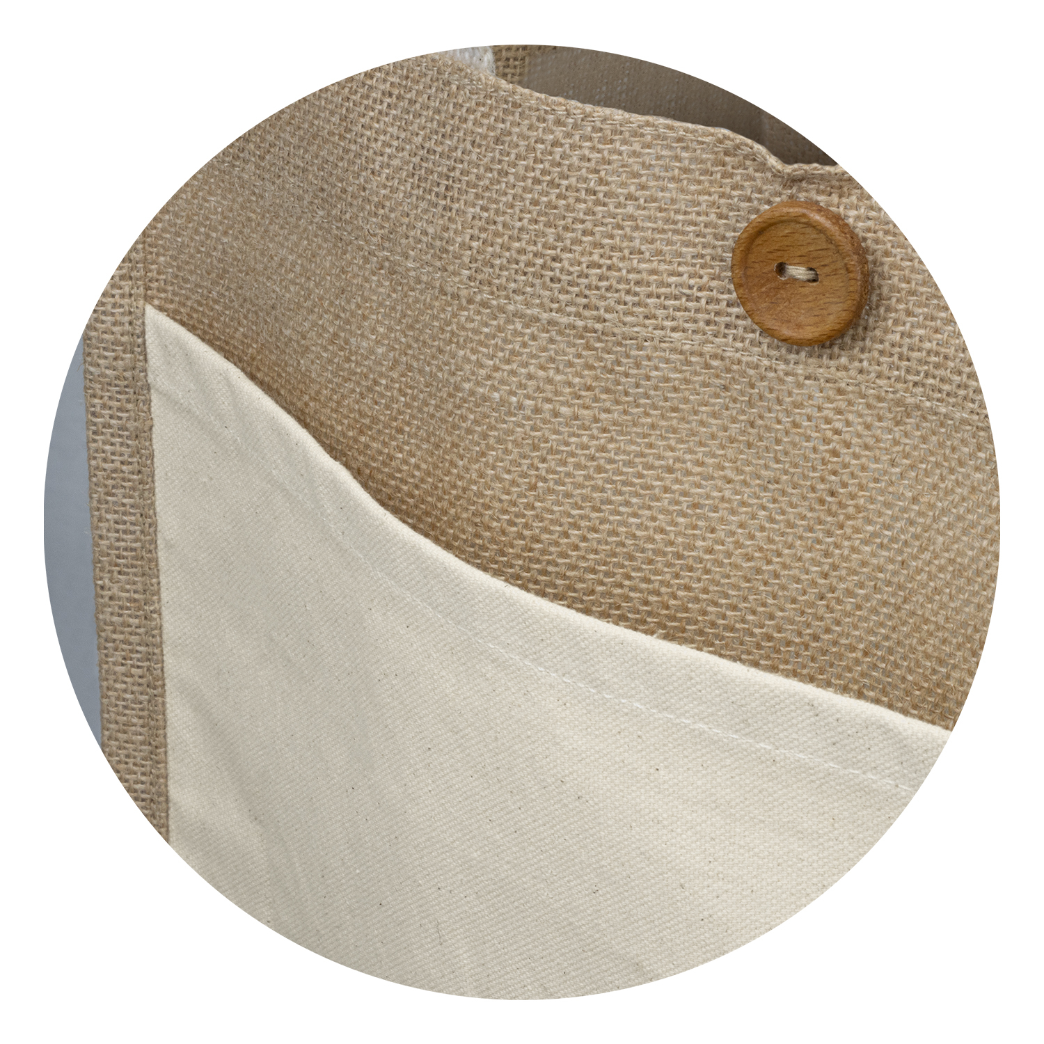 Stylish 290gsm jute tote bag with a large gusset and wooden button closure. The bag also features a 290gsm unbleached cotton slip pocket and long woven cotton carry handles.