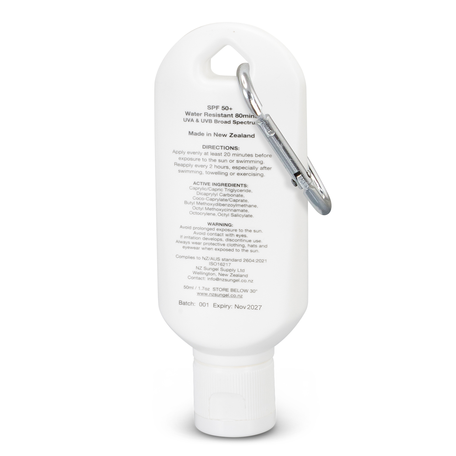 - Gel-based SPF50+ sunscreen in a 50ml tube with a carabiner