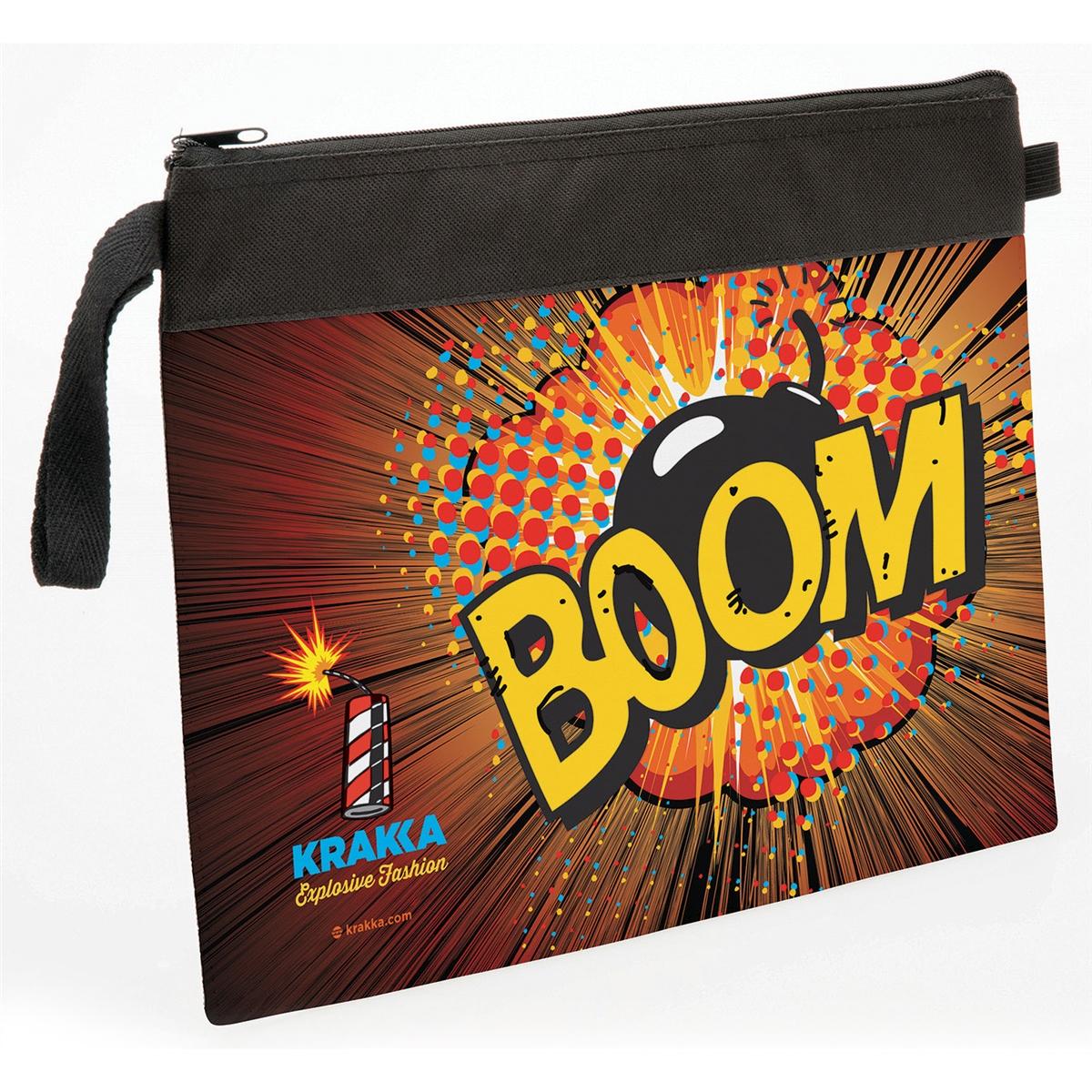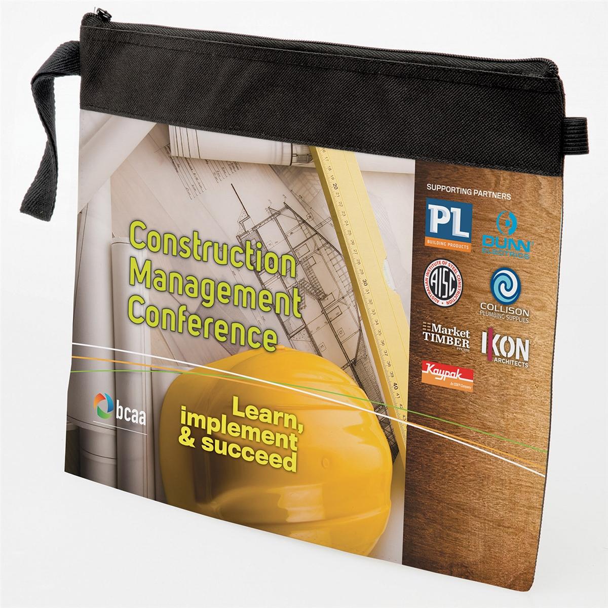 600D polyesterPoly/canvas sublimation panel on frontZip closure at topPen loopWrist strapBusiness card holder on backSize: 35cm W x 27cm HCapacity: 1.8 Litres