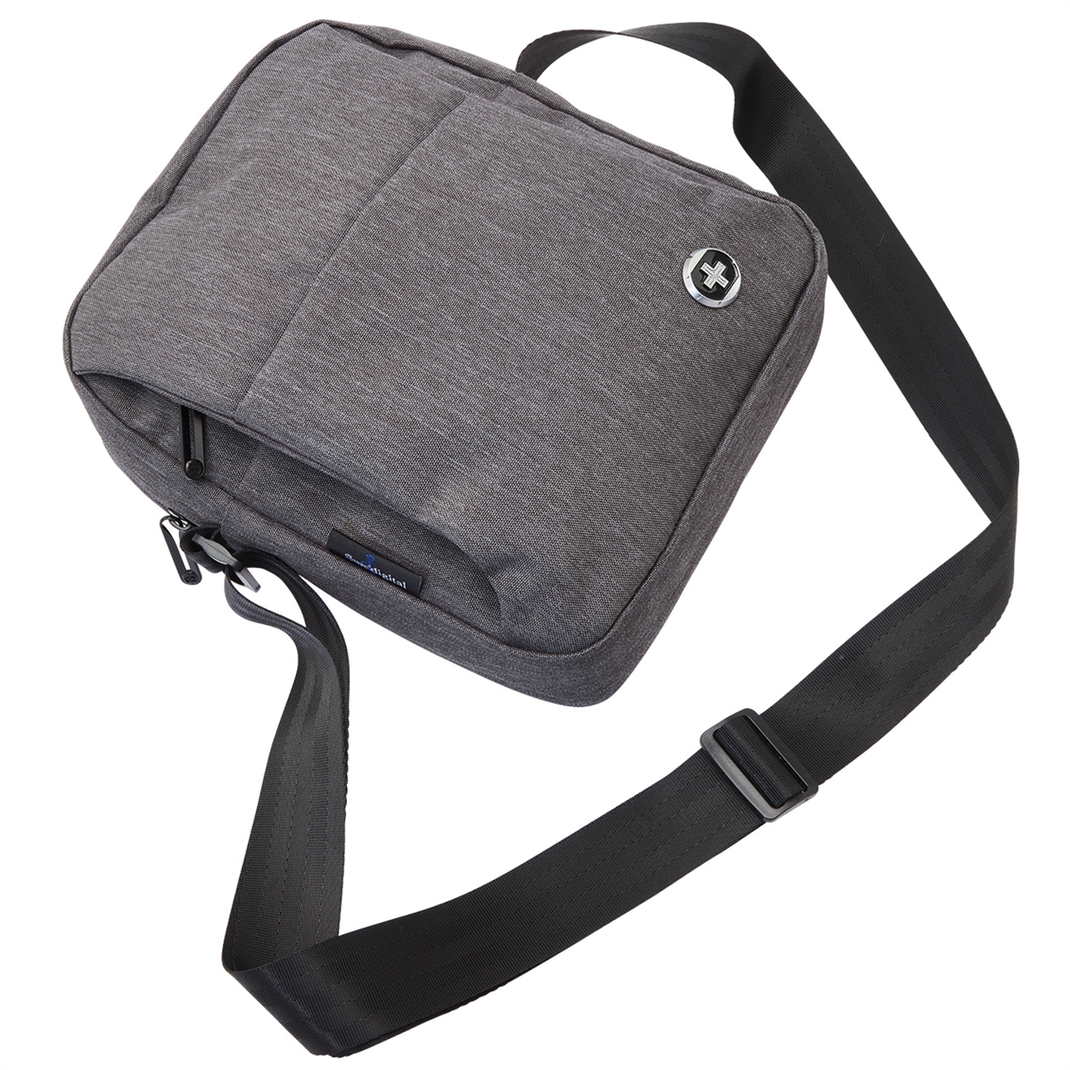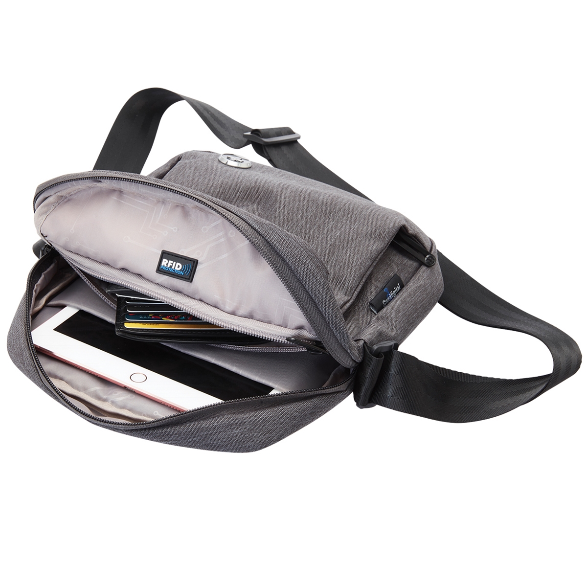 Jacquard fabric with PVC backingInterior lined with printed and branded 210D polyesterZippered main compartment with padded rear slip pocket to store notebooks/tablets and RFID data protection pocketHandy zippered front pocketQuality constructionAdjustable webbing shoulder strapBranded metal zip pullersBranded metal badge on frontSize: 20.5cm W x 25.5cm H x 6cm DCapacity: 3.1 Litres