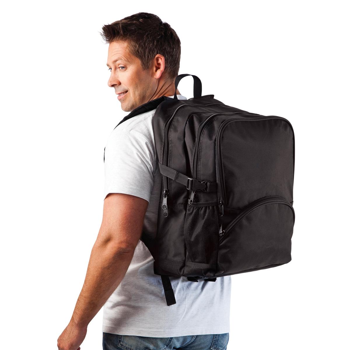 Jaquard nylon 1200D polyester heavy duty material2 large lockable double zip main compartments.Rear with mesh hanging valuables zip pocket.Zip front pocket with organiserKey clip and slip pocket with velcro closureHalf moon bottom zip front pocketElastic top mesh side pocketPadded back panel and padded adjustable shoulder strapsCompression strap with plastic release clips on sideCarry handleBusiness card holder on backSize: w33 x h50 x d22cmCapacity: 36 Litres