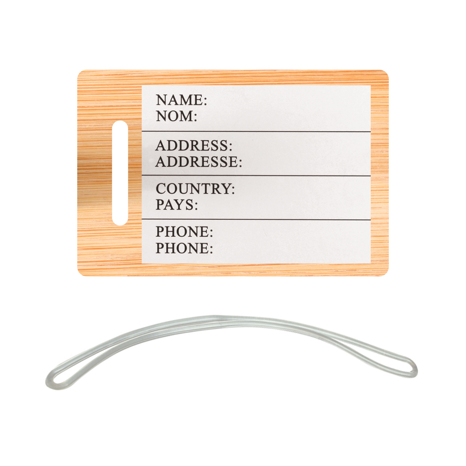 Introducing the Transit Bamboo Luggage Tag—a natural and eco-conscious accessory for your travel essentials. Made from durable bamboo, this luggage tag features a robust strap for secure attachment to bags. One side includes a personal details label, ensuring your information is easily accessible. Ideal for adding a touch of elegance to your luggage.